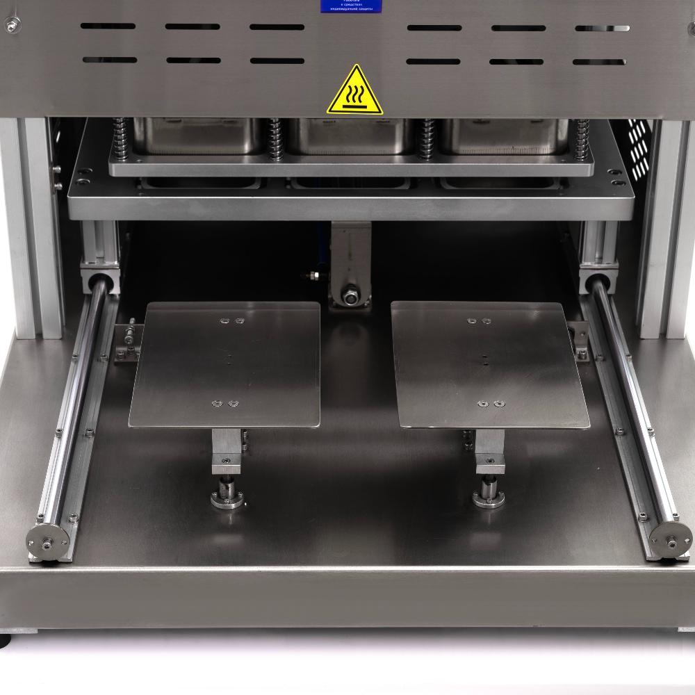 - Автоматизация и точная настройка. Управление осуществляется через сенсорный экран с возможностью программирования температуры нагрева (два терморегулятора), времени запечатывания, подъёма и накачивания газа. Аппарат автоматически обрезает плёнку по контуру лотка, обеспечивая аккуратную упаковку.