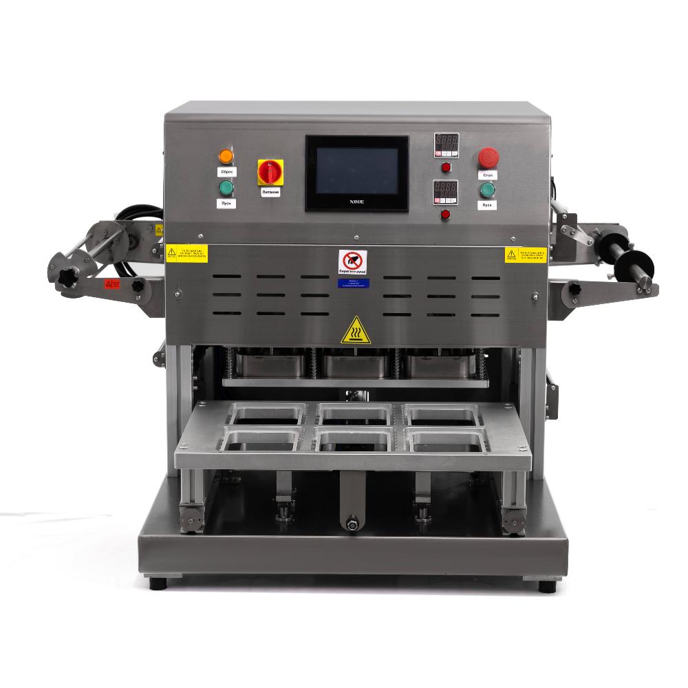 - это полуавтоматический аппарат для герметичной упаковки пищевых продуктов в готовые лотки (контейнеры) из пластика или алюминия. Оборудование удаляет воздух из упаковки и замещает его инертным газом (например, азотом), после чего термосваривает многослойную плёнку и обрезает её точно по контуру лотка. Модель оснащена комплектной матрицей размером 6 лотков размерами 187x137 мм, подходит для предприятий общественного питания, цехов по производству полуфабрикатов, мясной и мучной продукции, супермаркетов.
